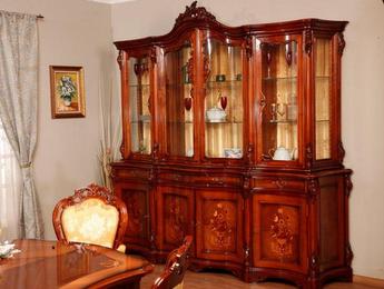 Nábytek z masivu Mara Bella je vyroben z buku a vkládán intarziemi z ořechu a třešně s bohatou ruční řezbou.